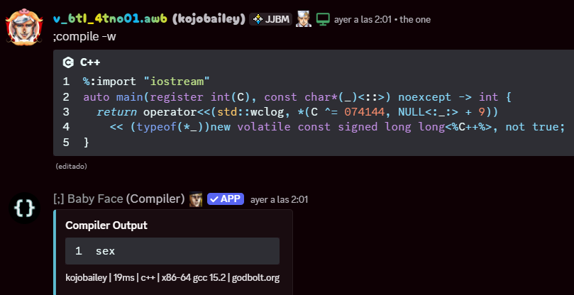 I wrote this code while playing around with compiler.gg which uses Godbolt’s Compiler Explorer. It is intended to be compiled in that environment, so if you want to test it yourself, do so via this link with the “x86-64 gcc 15.2” compiler option.